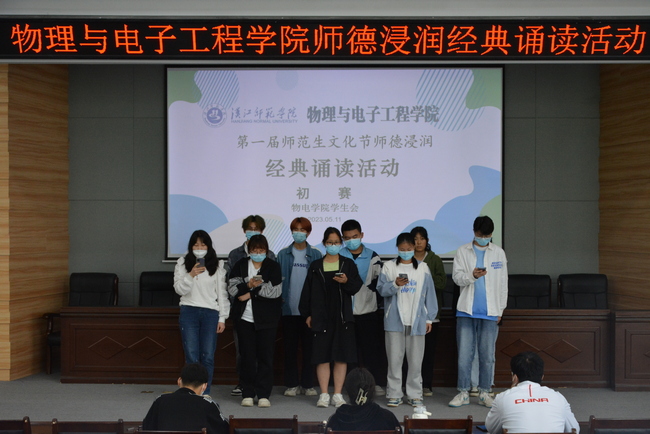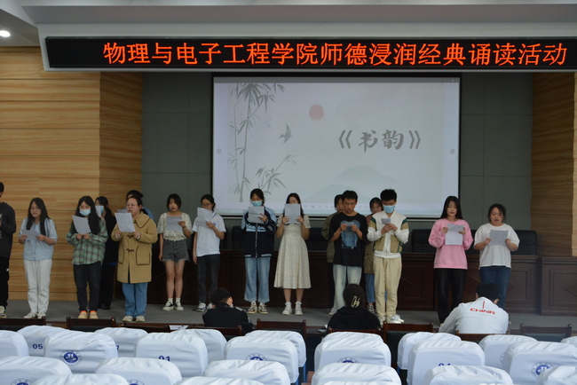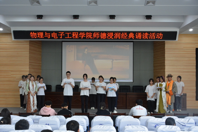 为发扬中华文化尊师重道的传统美德和培养优良师风,展示中华经典诗文的博大精深和艺术魅力,2023年5月11日,物电学院第一届师范生文化节师德沁润经典朗读活动于C101成功举行。本次活动邀请了李朦老师,范志鹏老师,杨林科同学以及崔天祥同学作为评委。