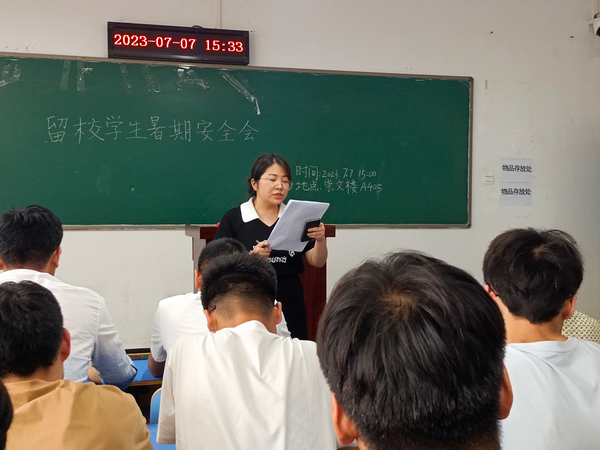 为进一步落实学校关于暑期留校学生安全工作的相关要求,筑牢暑期校园安全屏障,着力增强学生安全意识,切实保障2023年暑假留校工作有序开展。7月7日下午,bat365正版唯一官网在崇文楼A405教室召开2023年暑期留校学生安全教育大会。院分党委书记唐传球、全体辅导员老师、竞赛指导老师及全体暑期留校学生参加了大会。
