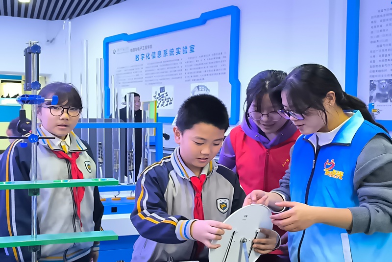 4月10至12日,物电学院“e点光”志愿服务队携手物理演示实验室开展实验室开放日活动。十堰市外国语小学的34名师生走进物理演示实验室体验科学的奥妙。