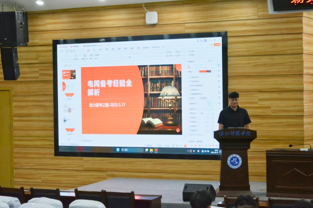 接着,现就职于国网竹溪县供电公司的2023届校友范国林以“立足国网招考新趋势,系统拆解备考策略”为主题进行分享。他提出"3+1"复习模型,即三个月分阶段攻克电路原理、电力系统分析等核心科目,同步穿插行测专项训练,并现场演示了继电保护典型题型的解题思路。针对面试环节,他建议学子建立"专业认知+岗位匹配"应答框架,结合智能电网建设等前沿方向展现专业素养。